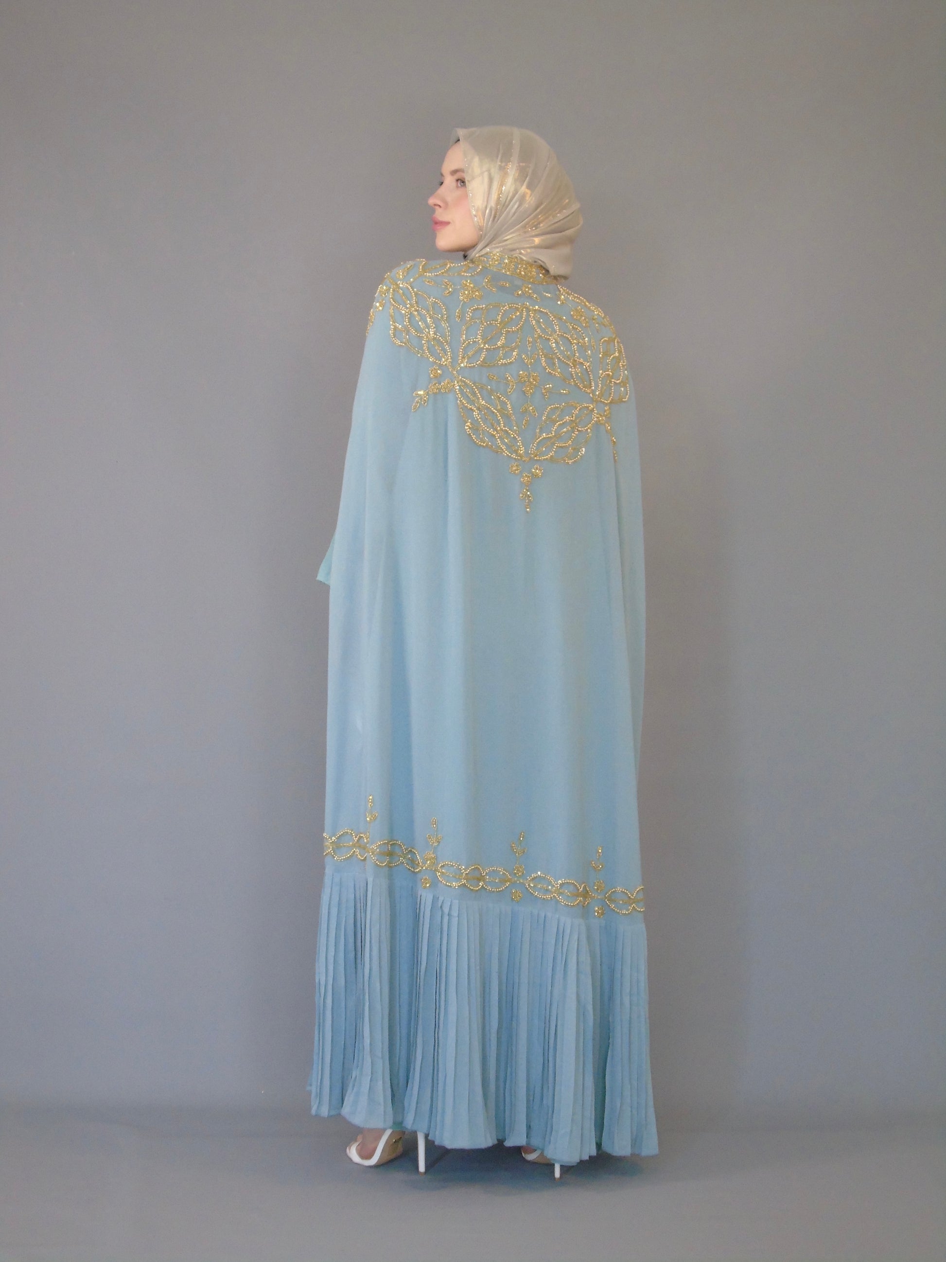 Upgrade your wardrobe with the Azraq Cape Abaya. This elegant piece features stunning hand-embellished gold details that add a touch of luxury to any outfit. With its versatile design, this cape abaya will elevate your look and make a statement at any event. Elevate your style with this unique and sophisticated piece.
