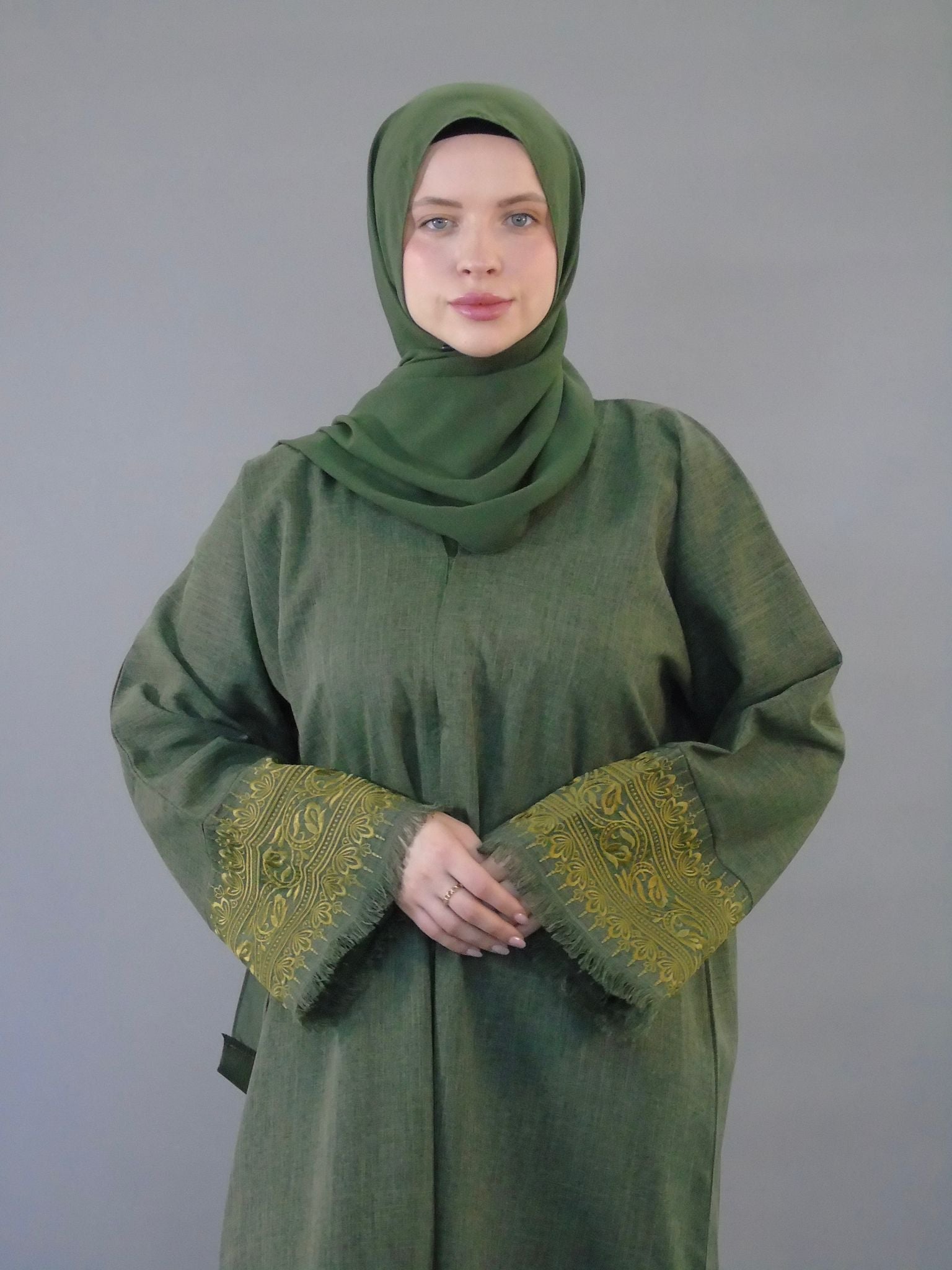 "Expertly crafted with beautiful embroidery, this open jacket and matching hijab set in Korean Nidha fabric will elevate any outfit. The green color adds a touch of elegance. Available in various sizes based on height for a perfect fit every time."