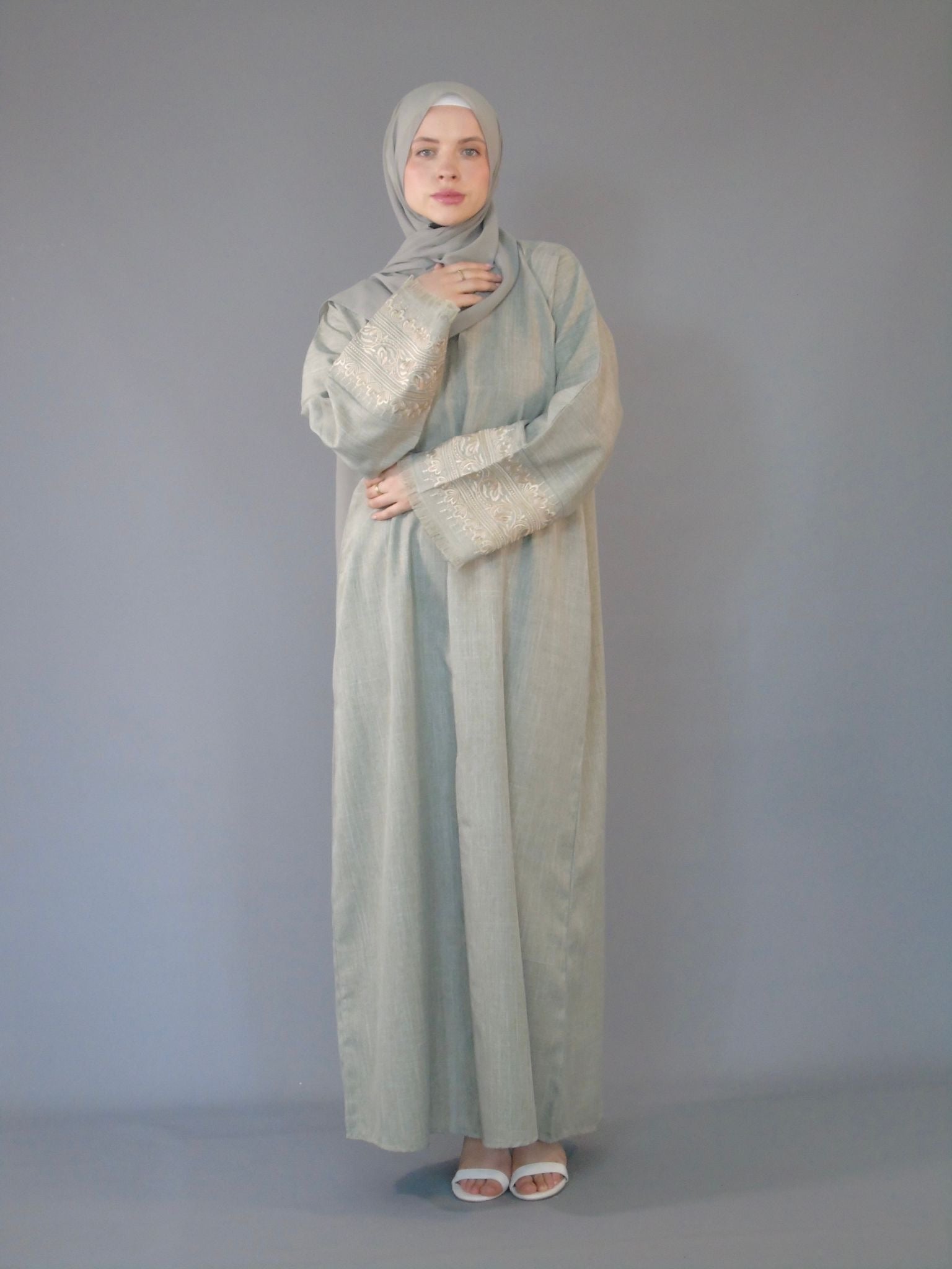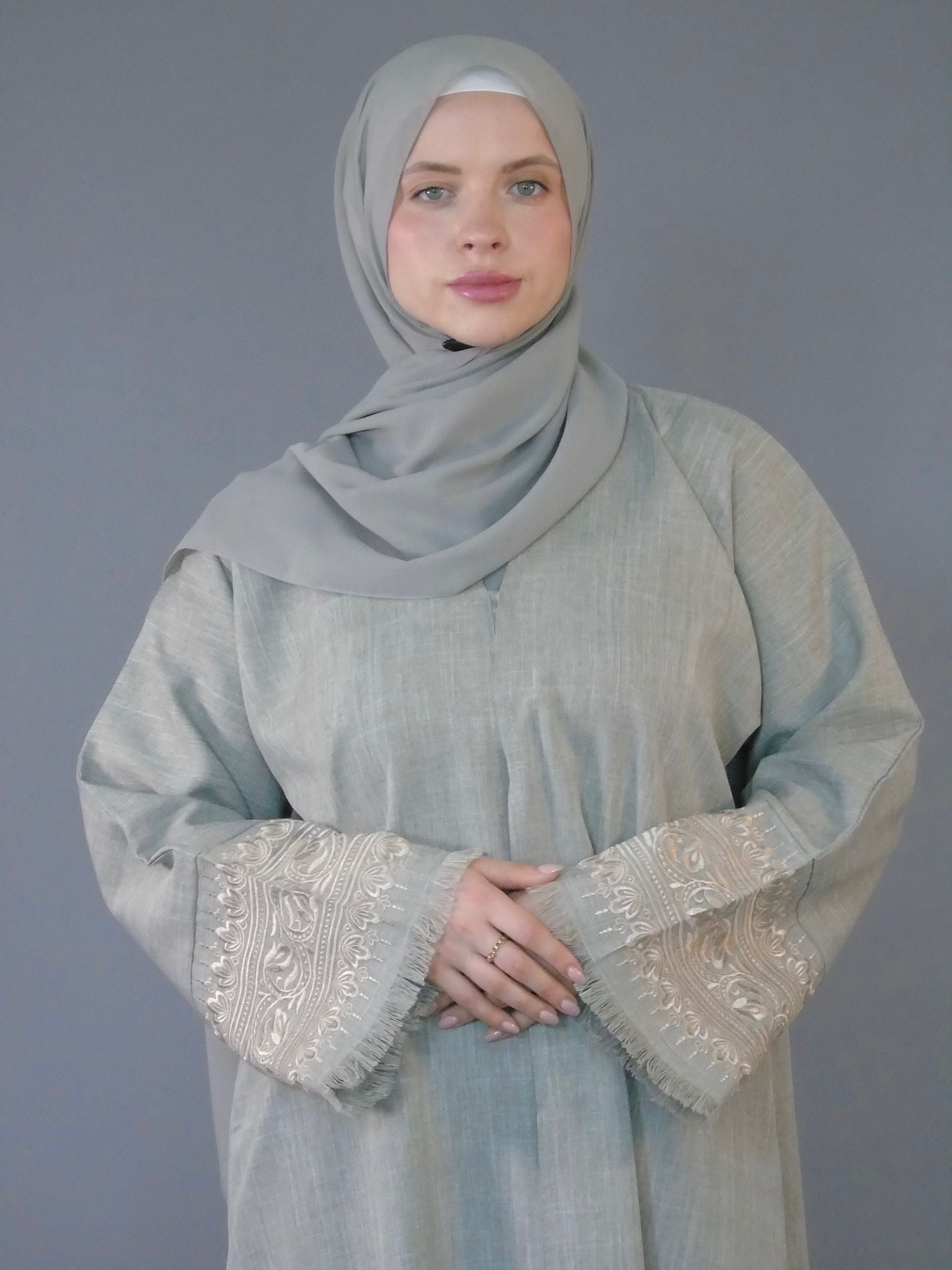 Introducing our Floral Abaya/Kimono! This stunning open jacket is adorned with embroidered sleeves and comes with a matching hijab. Made from high-quality linen fabric, the peach color adds a touch of elegance. Available in various sizes based on your height. Elevate your modest wardrobe with this floral inspired piece.