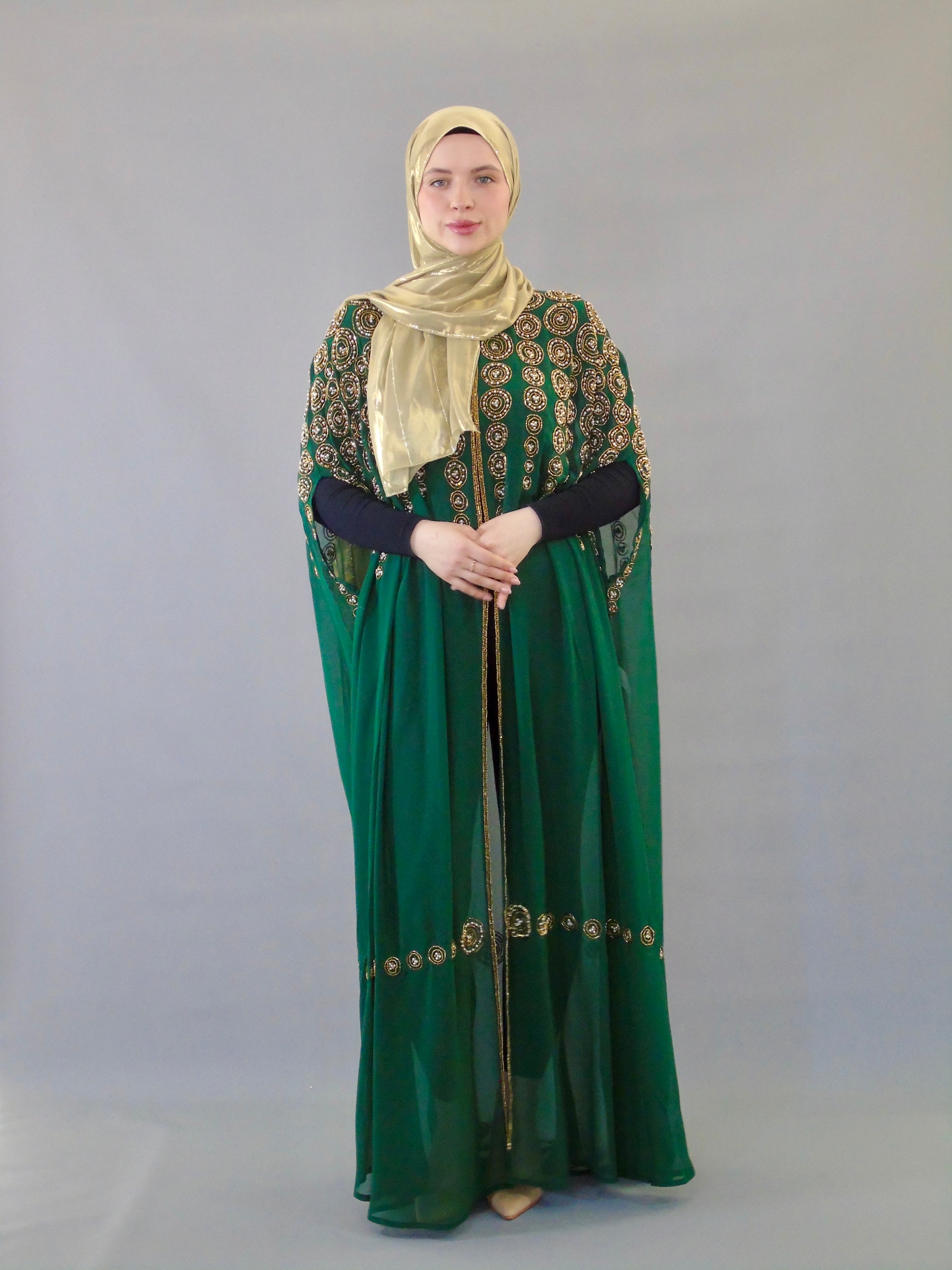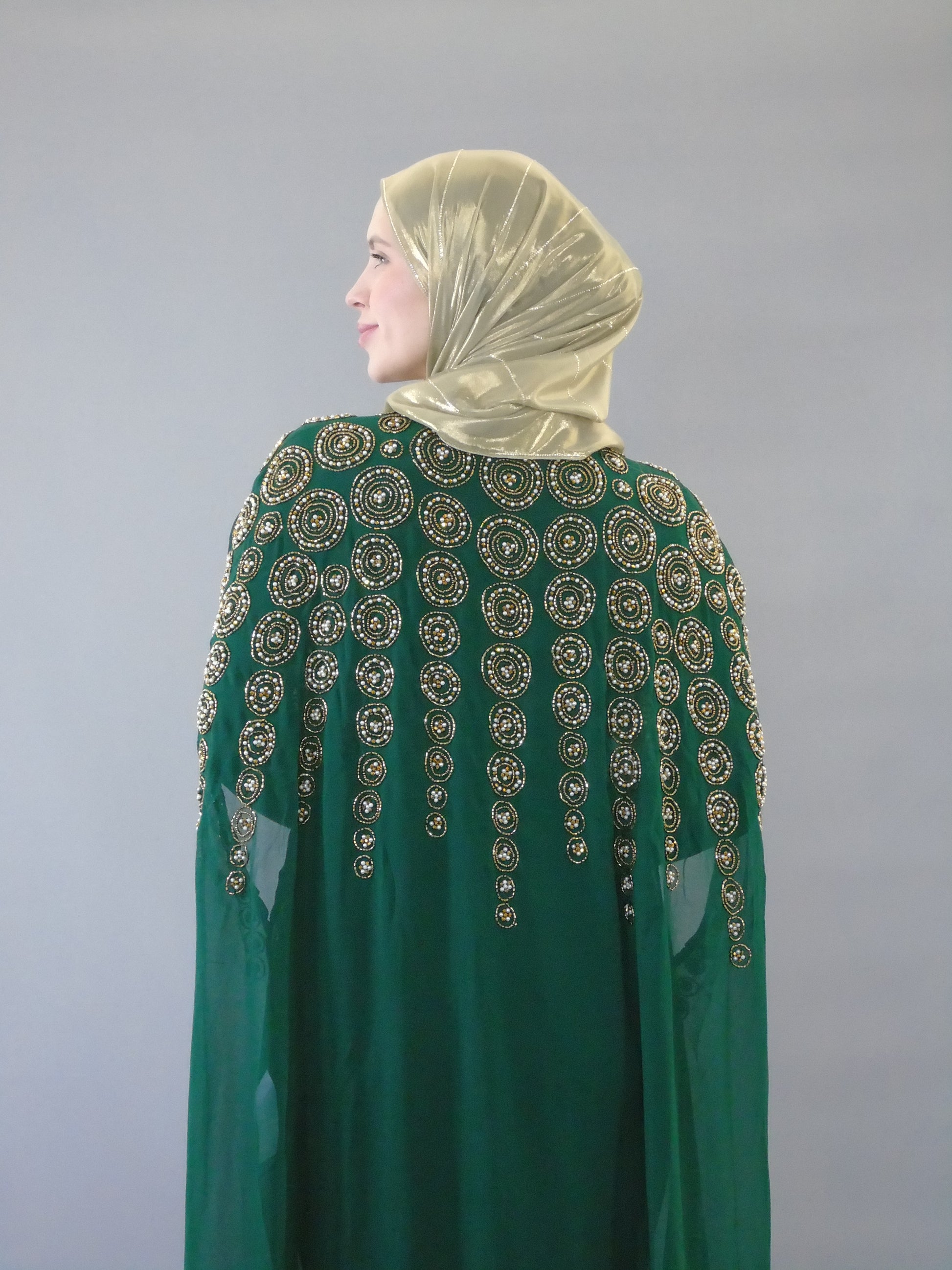 The Khadra Cape Abaya is an exquisite abaya adorned with hand bedded gold embellishments. This luxurious cape-style design adds a touch of elegance and glamour to your attire. Make a statement with this one-of-a-kind piece.