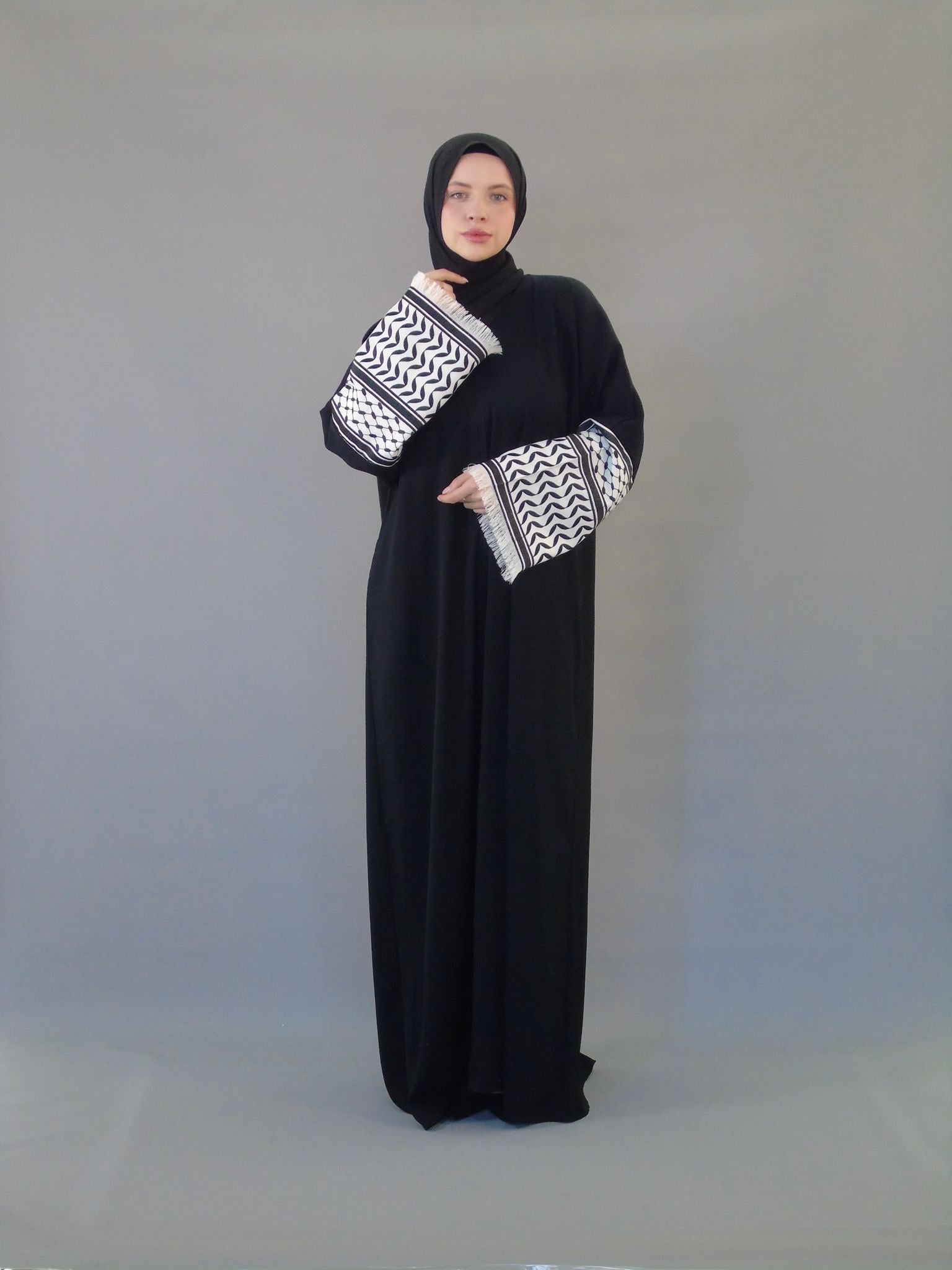 This black Palestine inspired Abaya / Kimono is made from Korean Nidha fabric and features embroidered sleeves. The open design allows for easy wear, while the matching hijab completes the look. Available in different sizes based on your height. Elevate your style with this elegant and culturally inspired piece.