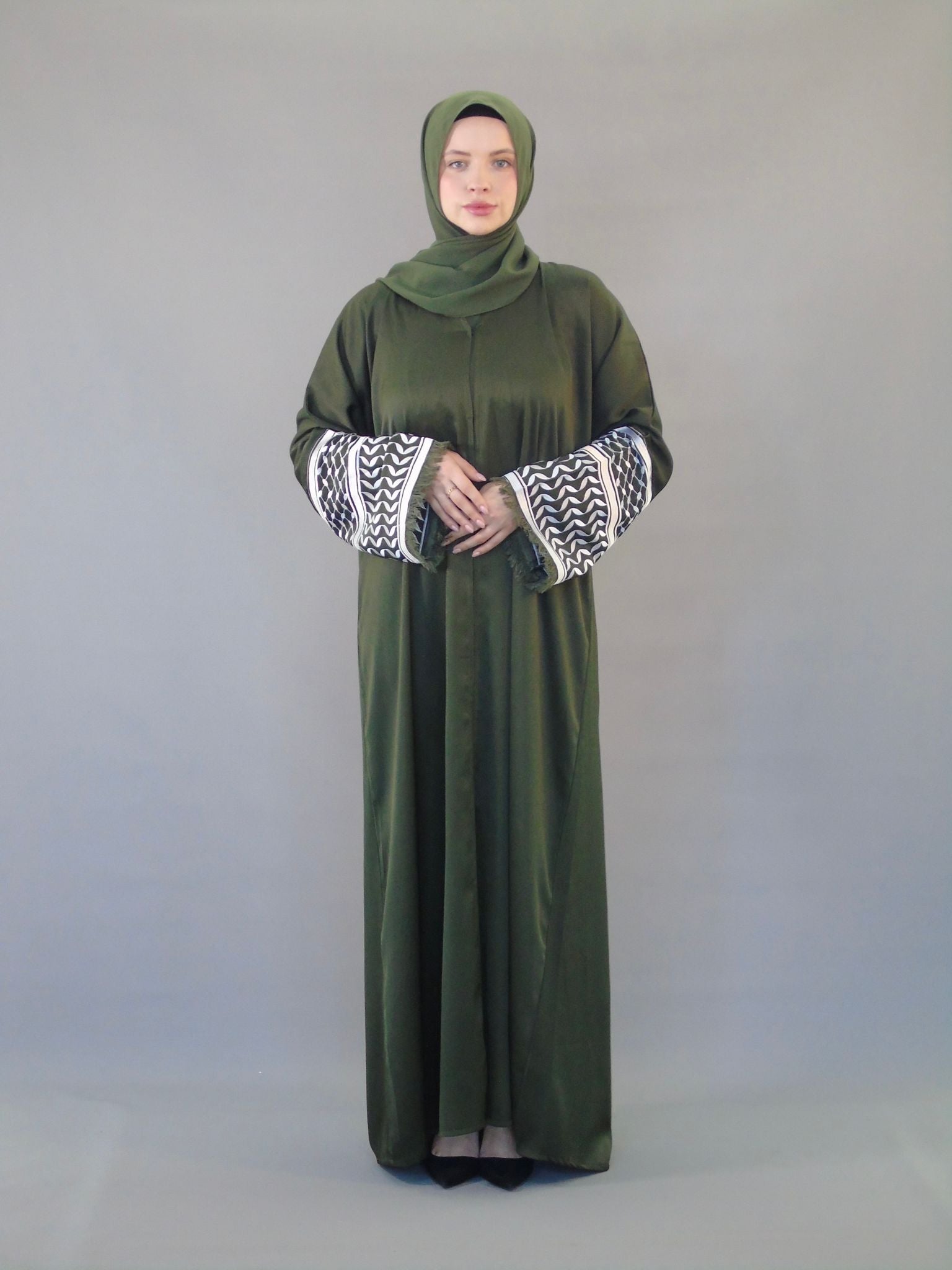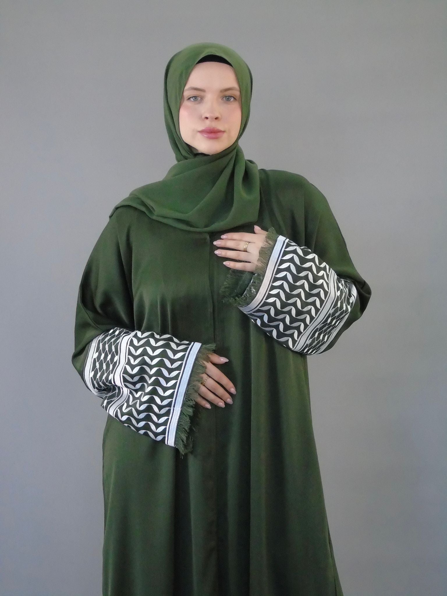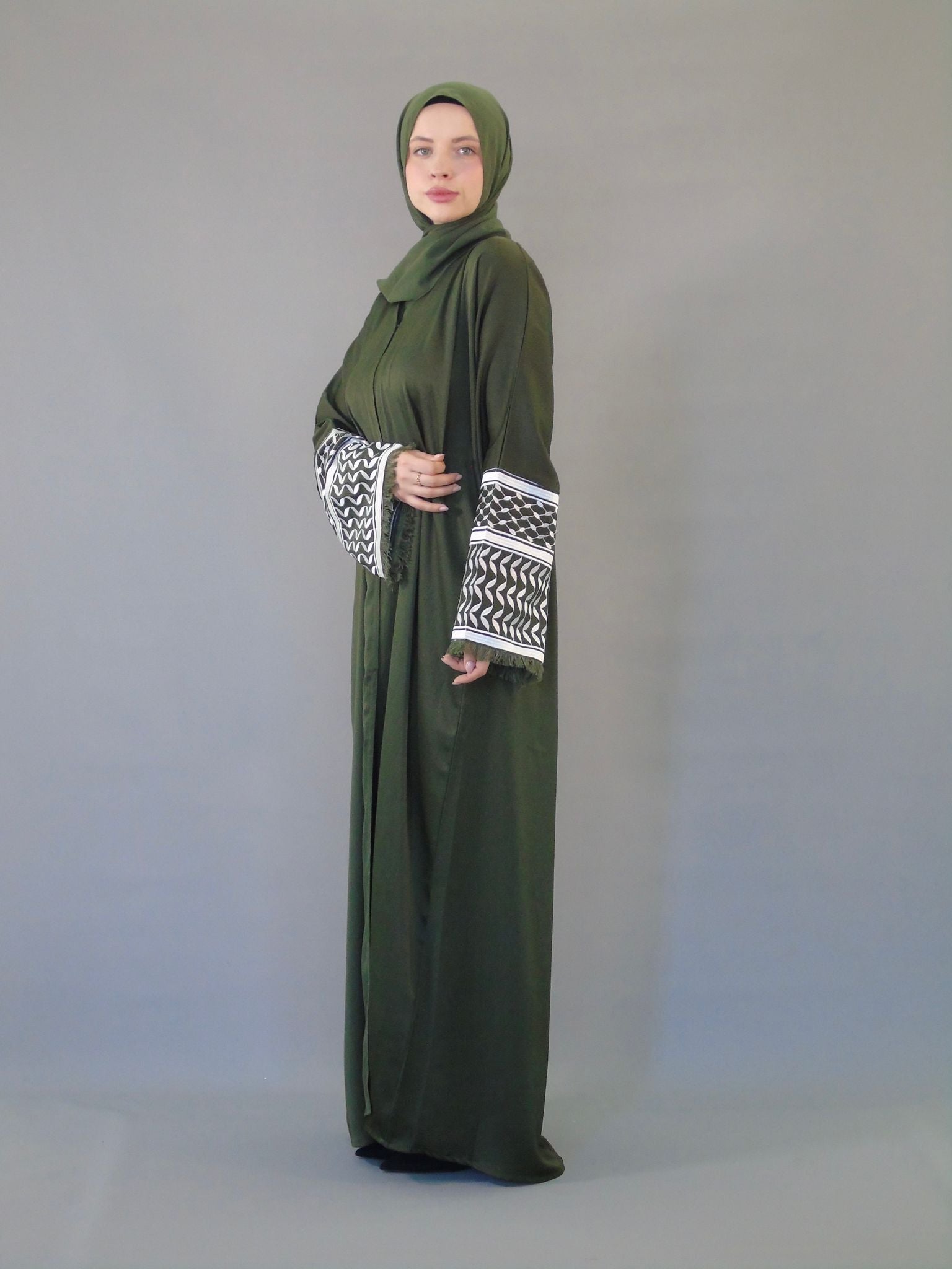 This Palestinian-inspired Abaya/Kimono is made from high-quality Korean Nidha fabric in a beautiful olive green color. The open jacket style allows for comfortable and versatile wear, and the embroidered sleeves add a touch of elegance. Comes with a matching hijab. Available in sizes based on height. Elevate your wardrobe with this unique and stylish piece.