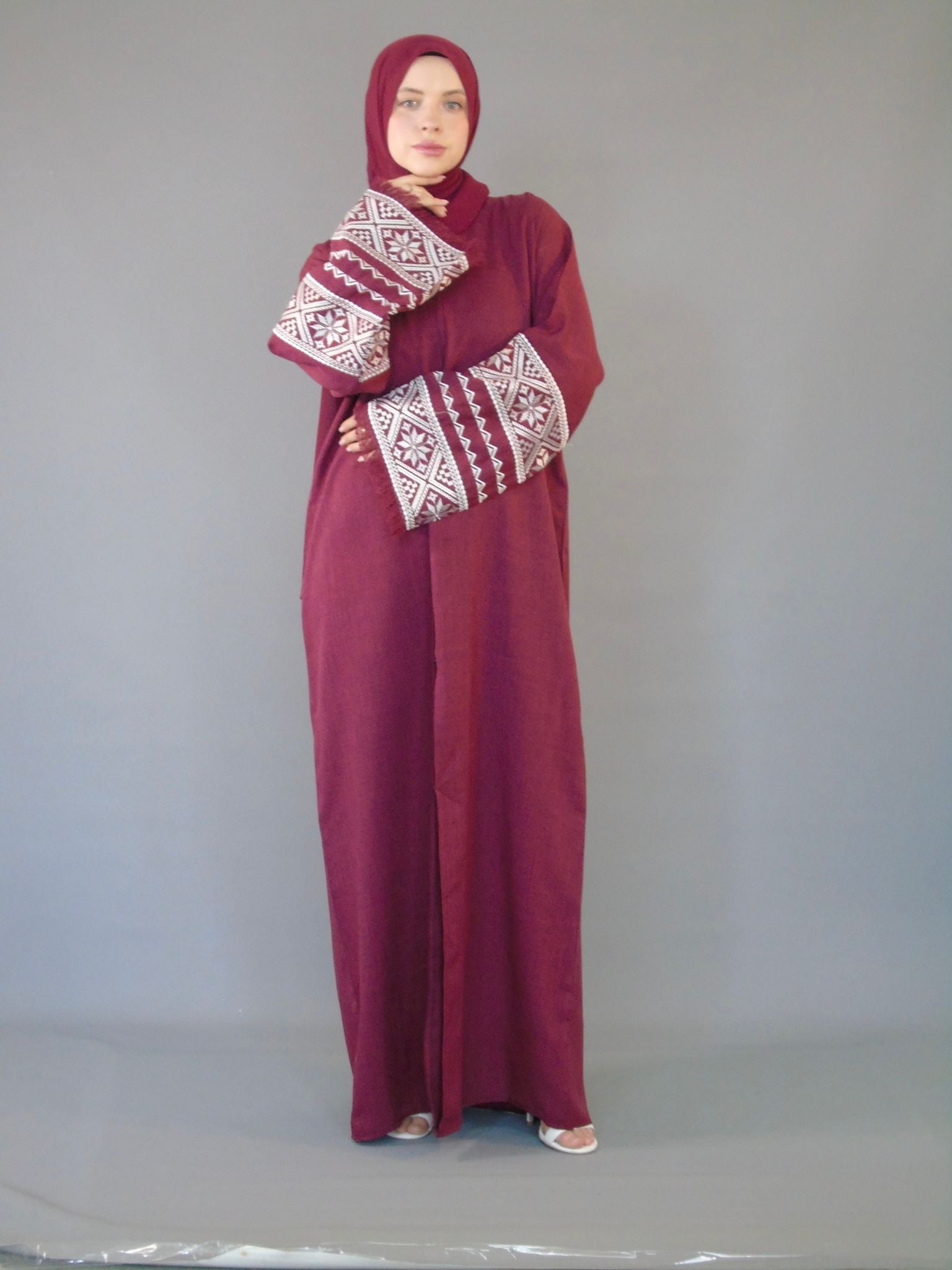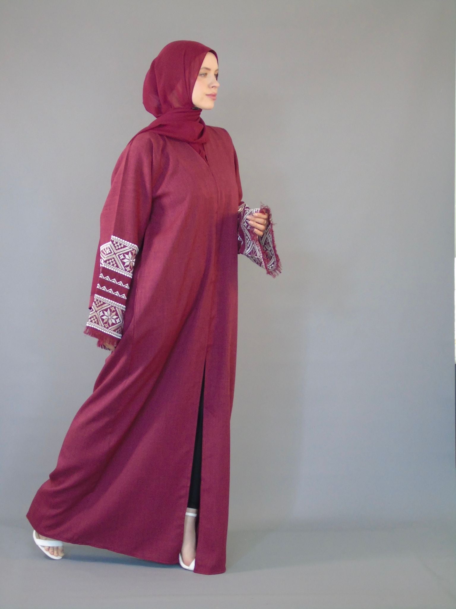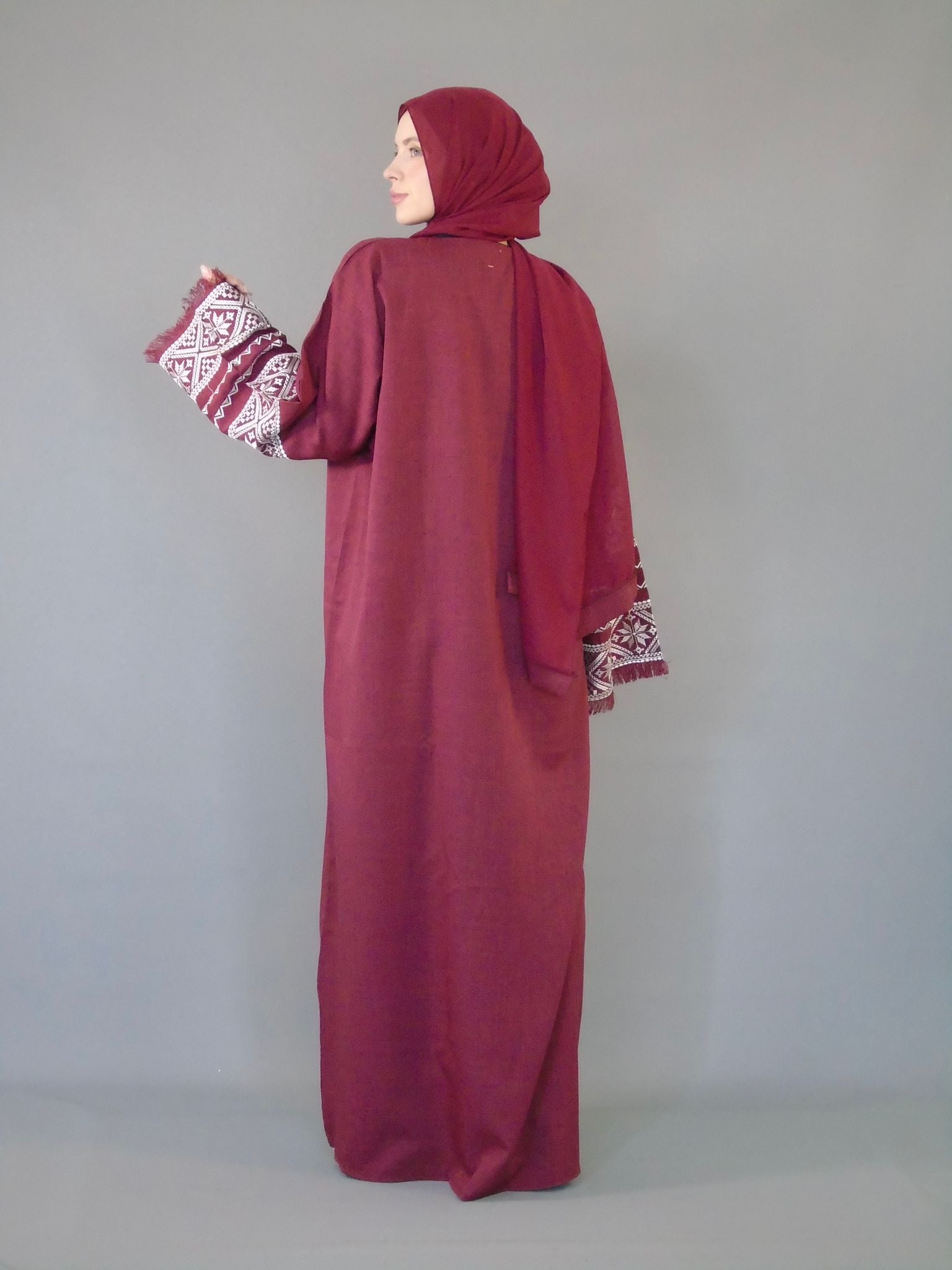 Introducing our stunning Palestine inspired Abaya/Kimono, crafted from high-quality linen fabric in a rich maroon color. This open jacket features intricately embroidered sleeves and comes with a matching hijab. Available in sizes based on your height, experience the beauty and cultural significance of Palestine with every wear.